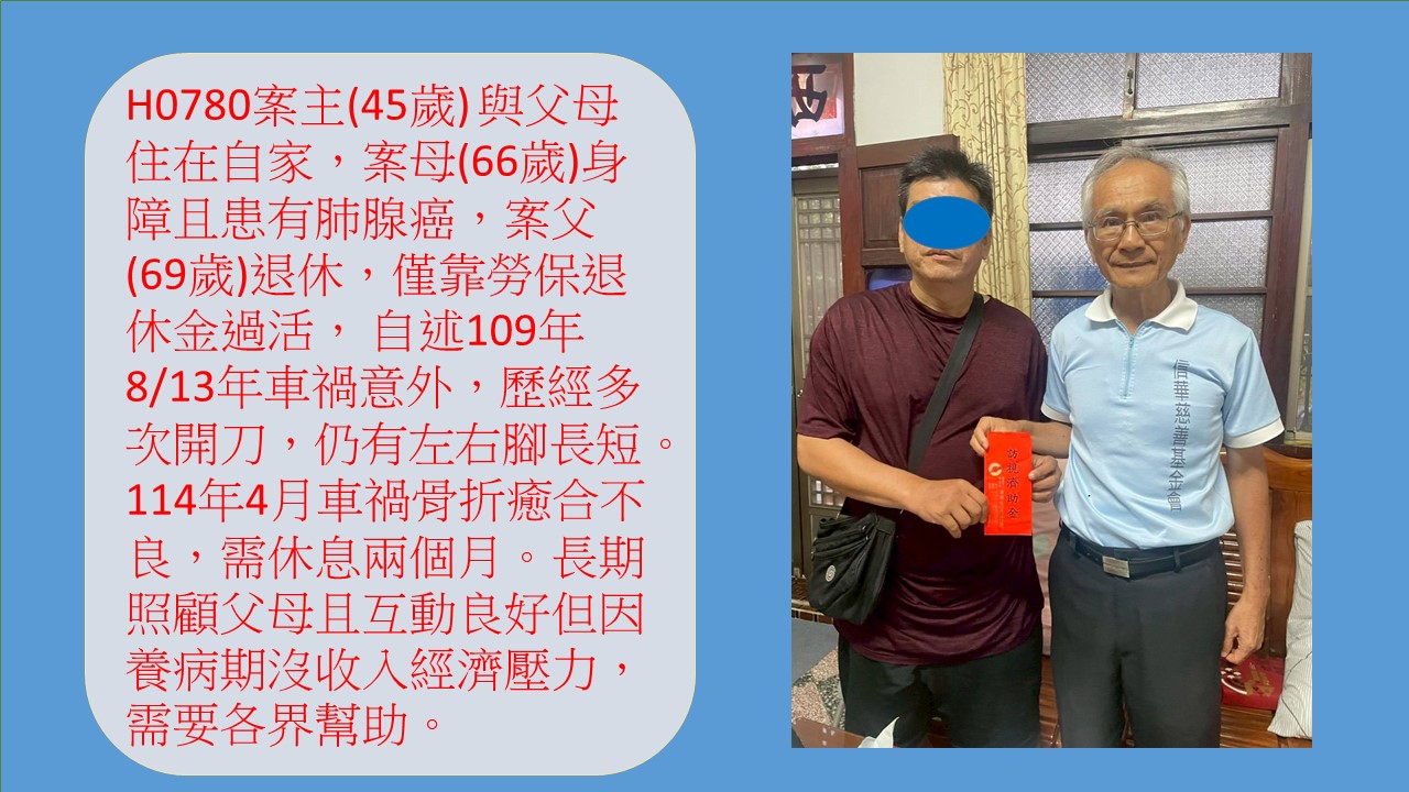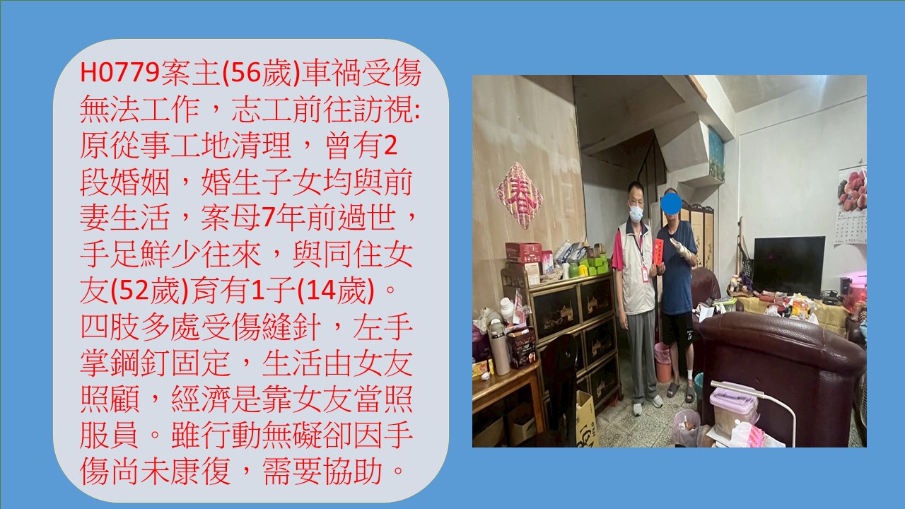 案主(44歲)單親,育有一女(12歲),與案母(66歲)三人同住在祖厝房子,案主原從事運輸送貨司機工作,為家中主經濟來源者,今年7月不幸發生車禍導致臉部及左下肢