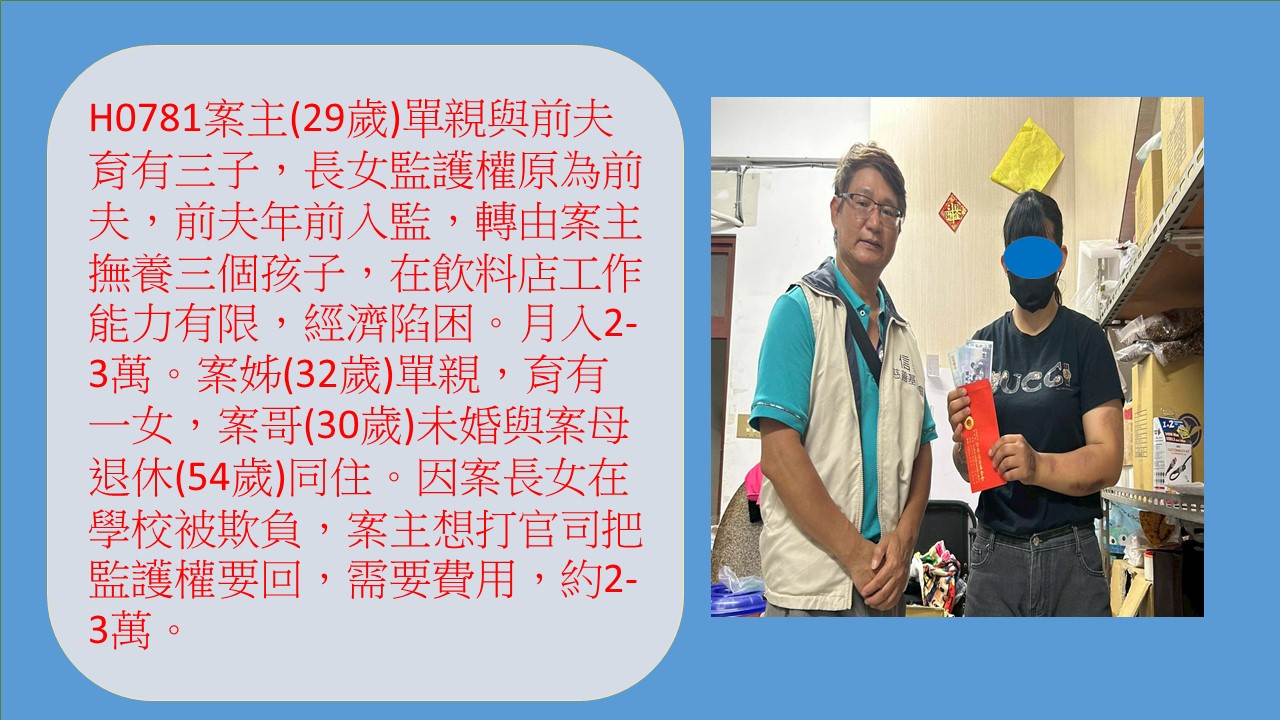 案主(29歲)單親與前夫育有三個孩子,長女監護權原為前夫,前夫年前入監服刑,長女假日都由案主照顧,案主一人撫養三個孩子,能力有限,經濟陷困。案主在飲料店工作,住