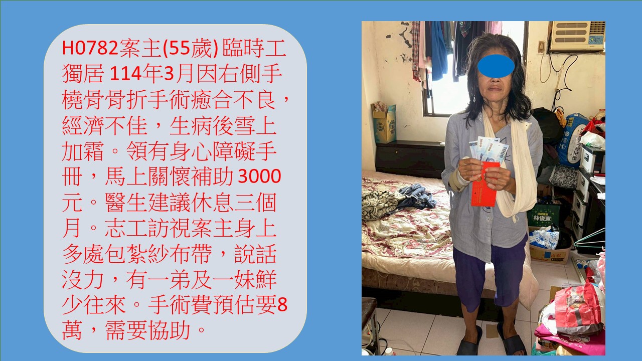 案主(55歲) 獨居 114年3月因右側手橈骨骨折手術癒合不良,過去擔任臨時工,經濟不佳霜。領有身心障礙手冊。領有馬上關懷。醫生建議復健休息三個月。志工訪視時案