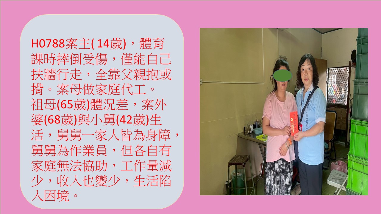 H0788 案主(14歲)在學校受傷導致雙腳膝蓋開刀,行動不便,案父(43歲)因抱及揹著案主導致脊椎舊傷復發,案母(40歲)原從事家庭代工,也因照顧案主,工作量
