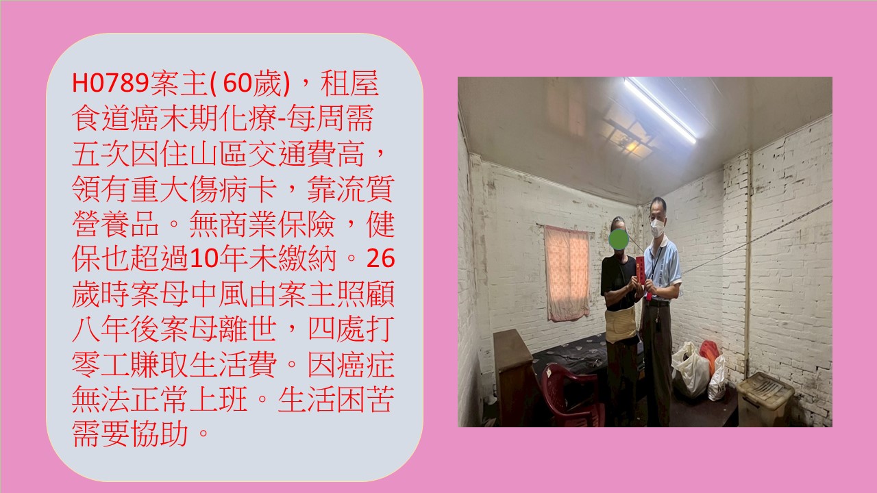H0789 案主(60歲)未婚,原從事粗工,雙親及案兄過世多年。自述在年初時覺得吃東西有異樣,但要工作,沒特別留意,直到6月發現不對勁才去醫院檢查,確診食道癌第