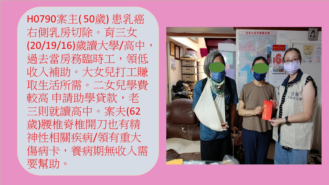 案主(50歲) 已婚,5/16 進行右側乳房切除手術。與有三女( 20/19/16) 分別就讀大學跟高中,案主過去擔任臨時工/房務,領有低收入身分補助 9485