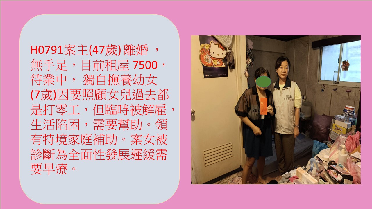 案主(47歲)離婚,租屋,住在頂加,目前無業並獨自撫養幼女(7歲)照顧女兒過去都是打零工,但因工作無故被解雇,生活陷困需要幫助。領有特境家庭補助 2850,案女