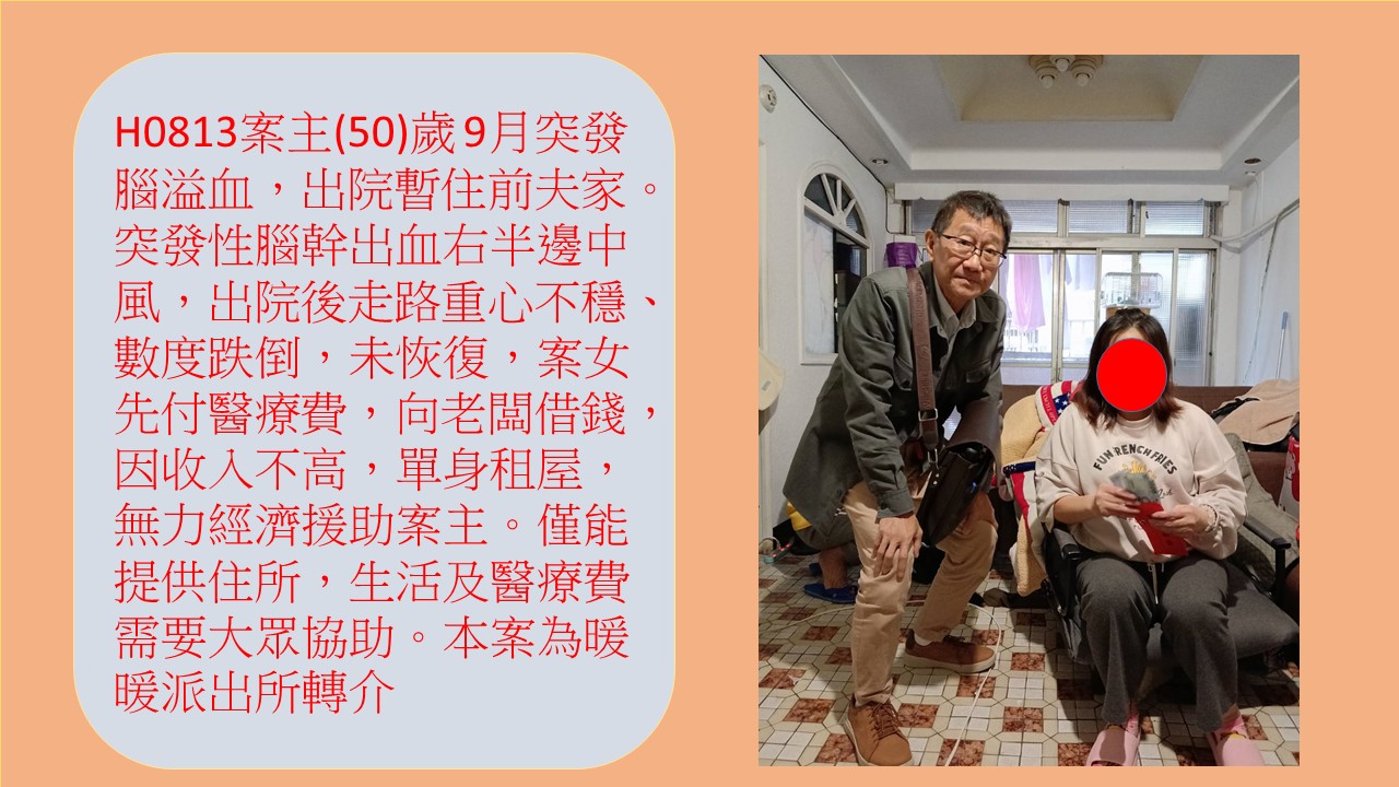 案主(50)歲 離婚 有一女 剛開始上班。案主9月突發腦溢血,出院暫住前夫家。突發性腦幹出血右半邊中風,走路重心不穩、數度跌倒,案女先付醫療費,向公司借錢,因收