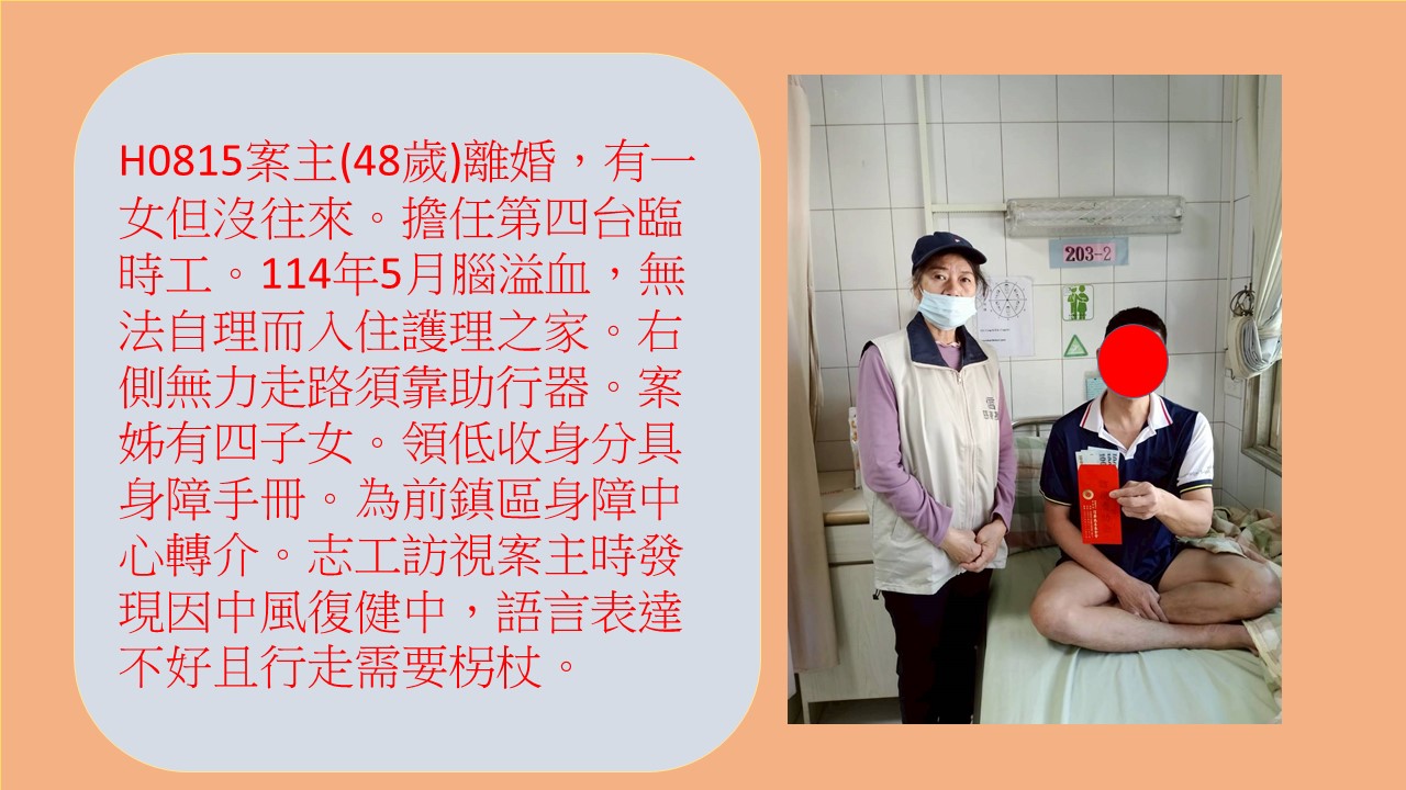 案主(48歲)離婚,有一女,第四台臨時安裝人員(無勞健保)。114年因腦溢血入住醫院後因無法自理而被案姊送入護理之家。案主目前因右側無力走路須靠助行器輔助。案姊