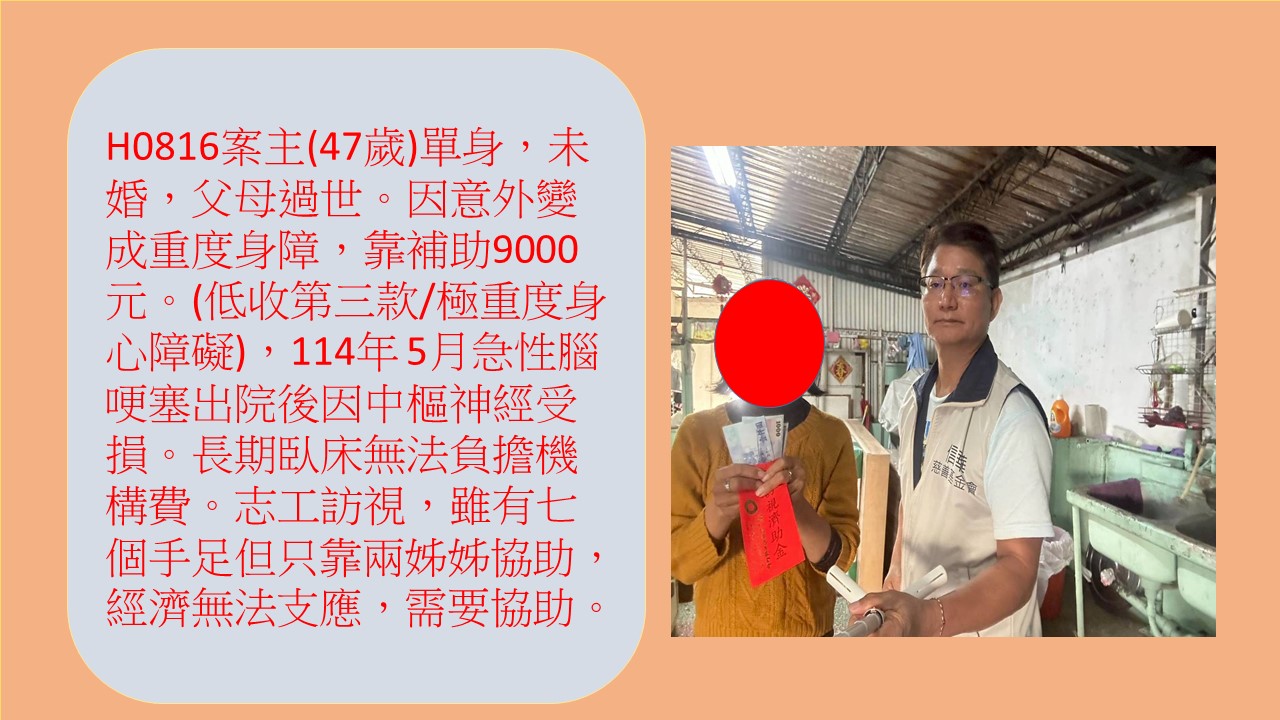 H0795案主(69歲)離婚,案父與與大哥過世,與女性友人同住,過去擔任玻璃櫥窗工。領有重度身障與低收補助 9500/月,租屋6500。 114年7月近期開疝氣