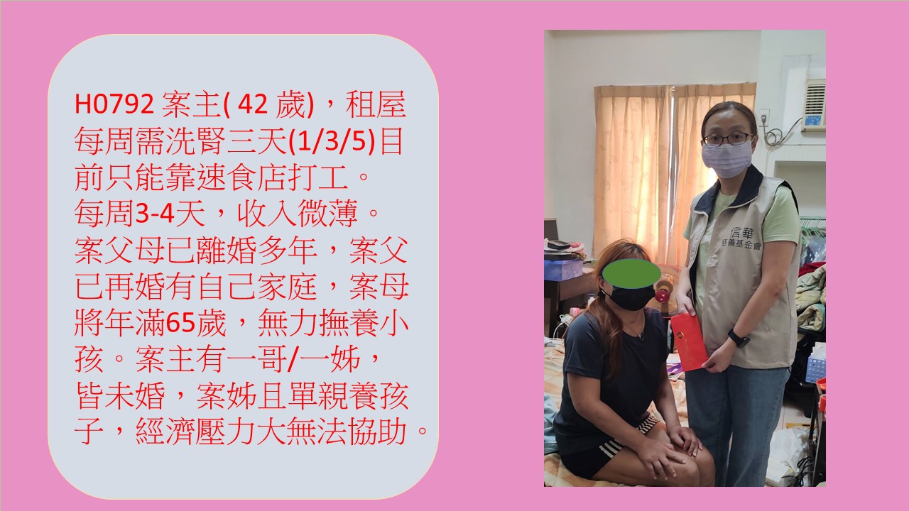 H0792案主(43歲) 租屋7000,離婚,長年洗腎,每周需洗腎三次,患有睡眠障礙/焦慮症,靠低收第二款補助與速食店打零工過活,左手血管瘤過大需緊急開刀,暫時