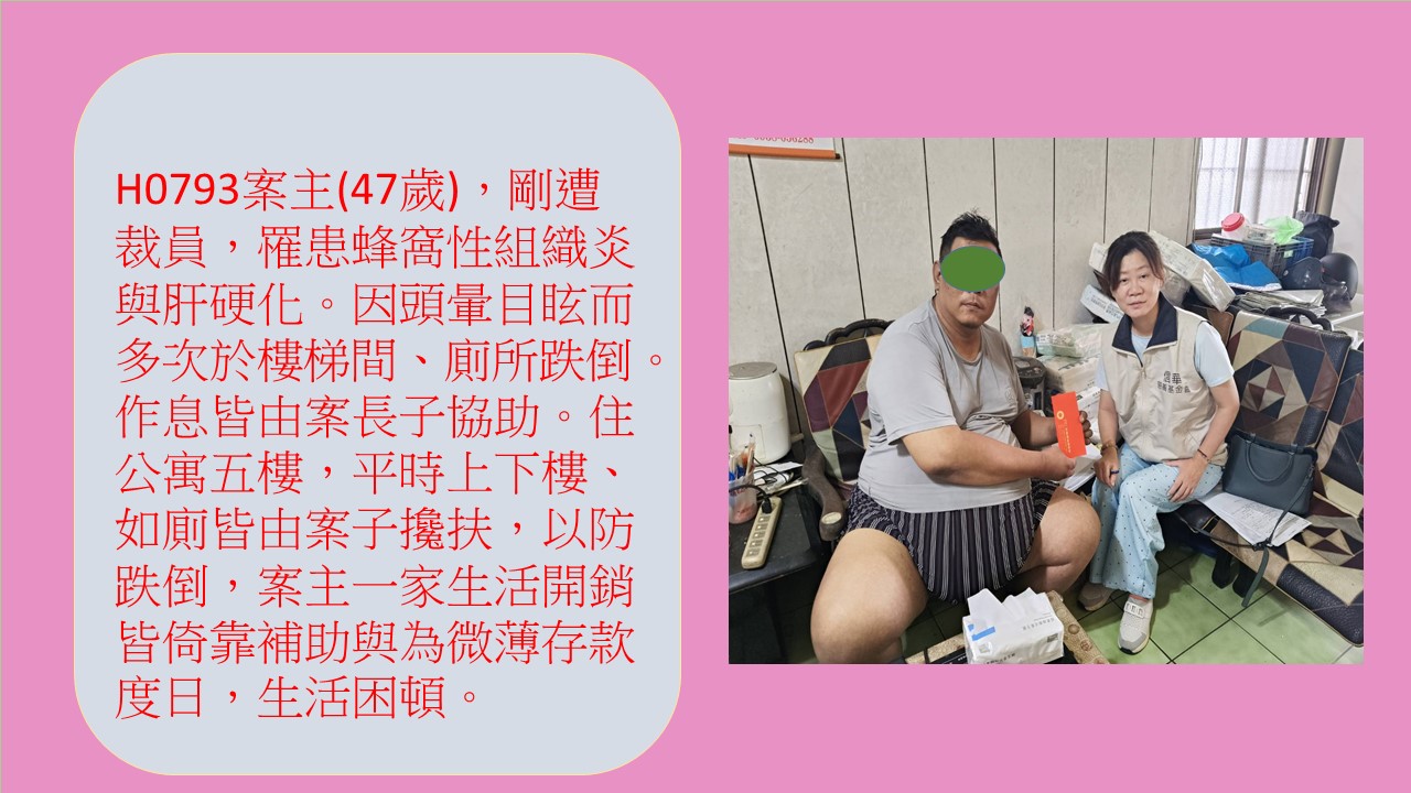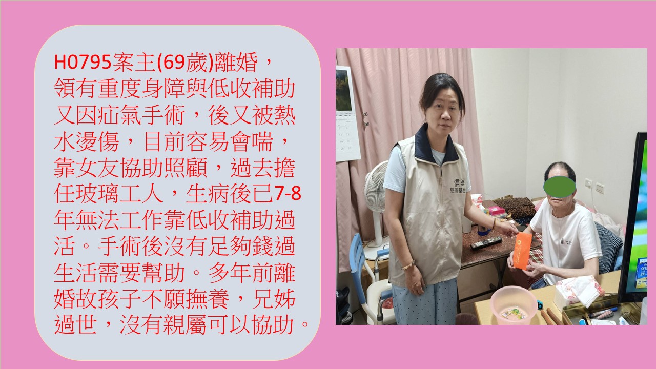 H0795案主(69歲)離婚,案父與與大哥過世,與女性友人同住,過去擔任玻璃櫥窗工。領有重度身障與低收補助 9500/月,租屋6500。 114年7月近期開疝氣