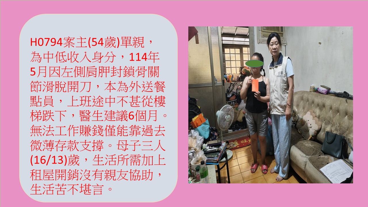 H0794案主(54歲)單親 為中低收入身分,5/14 因左側肩胛封鎖骨關節滑脫開刀,過去為外送員,無勞健保,上班途中不甚從樓梯跌下,醫生建議6個月。養病期間僅