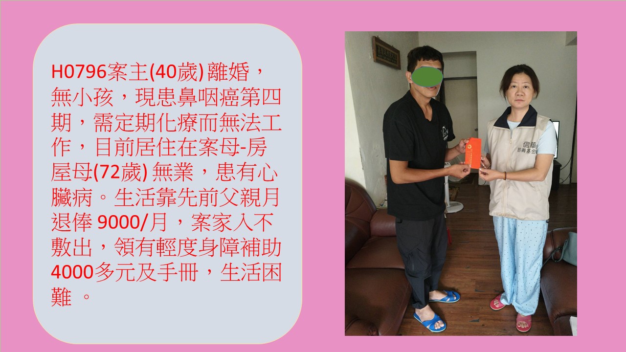 案主(40歲) 離婚, 無小孩,105年淋巴癌後轉移鼻咽癌第四期,需定期化療而無法工作'