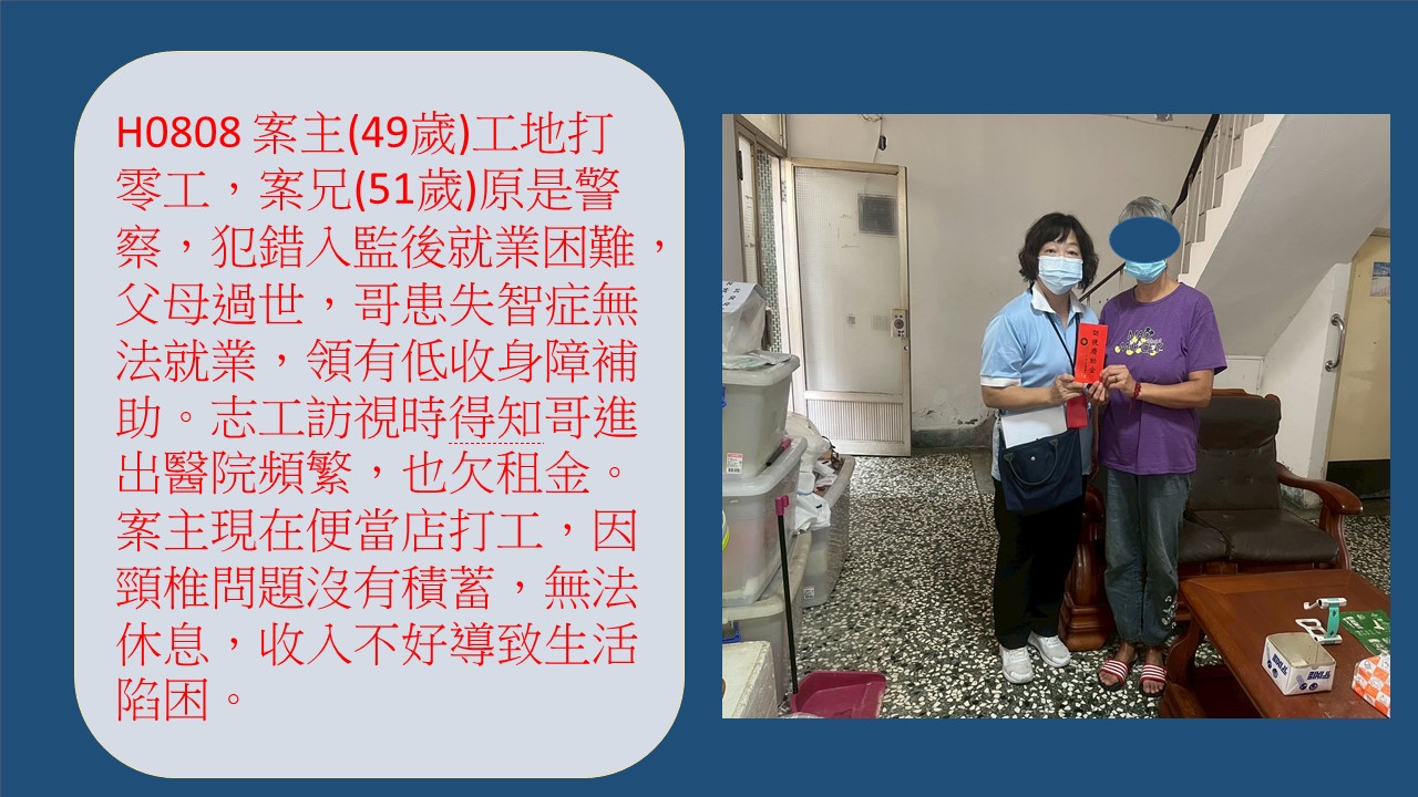 案主(49歲)在工地上班,日薪1,300,案兄(51歲)原是警察,因犯錯入監服刑,出獄後找工作不易,兄妹倆相依為命,兩人經常工地做簡單清潔工作,但案兄體況出現問