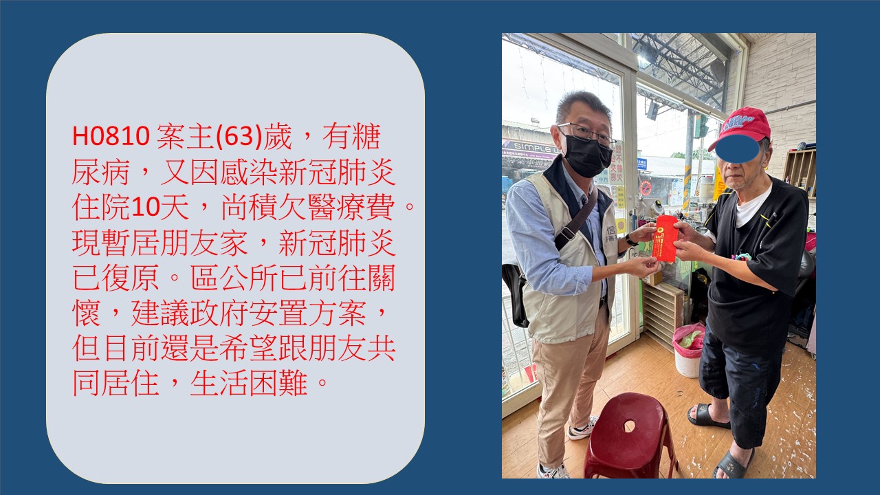 (63歲)未婚,過去有工作後因患糖尿病,又因感染新冠肺炎於住院10天,114/08月出院,尚積欠醫療費,積蓄也見底。因年紀大體力不好,找工作不易。訪視:案主(ˊ