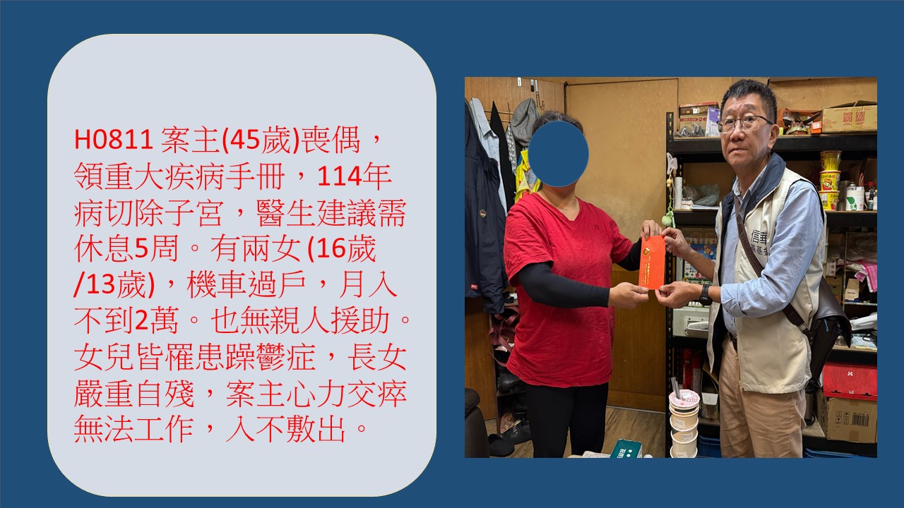 案主(45歲)喪偶,領有重大疾病手冊,114年8/27因病切除子宮無法工作,醫生建議需休息。有兩女 (高一16歲/小六13歲) 過去靠擔任臨時工,機車過戶工作人