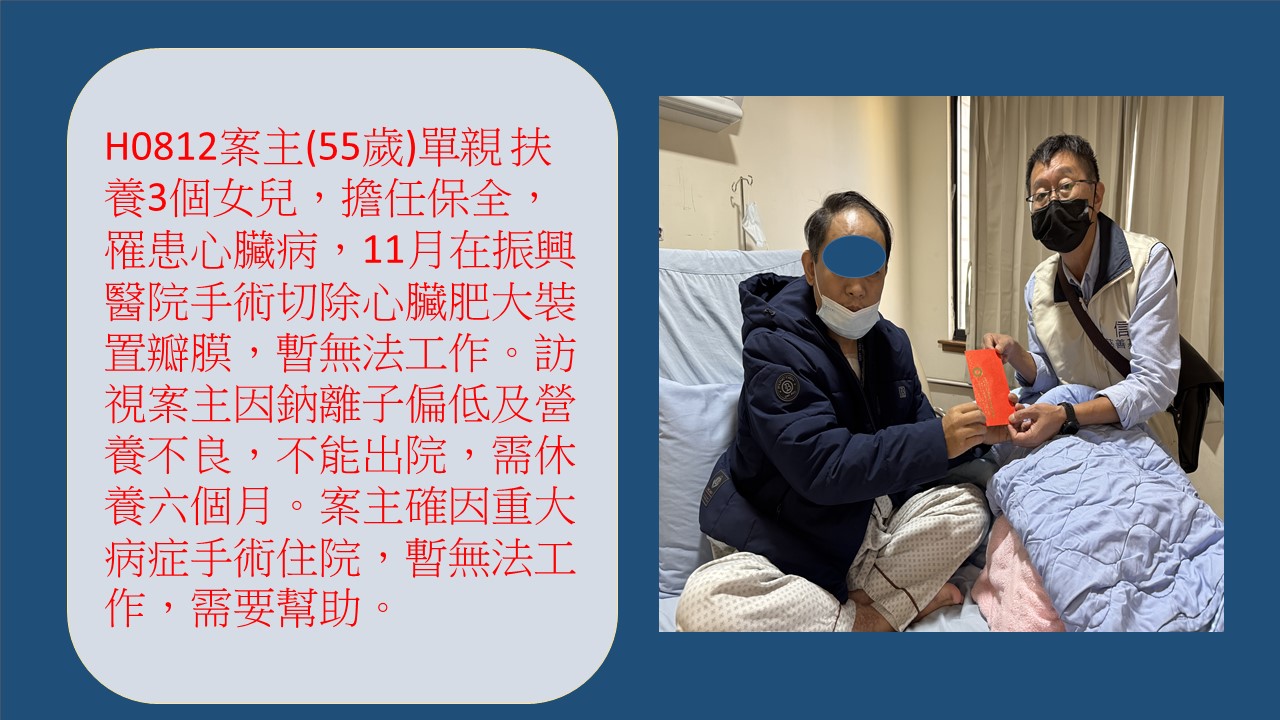 案主(55歲)單親扶養3個女兒,擔任保全,月收入約4萬元,為家中主要經濟來源,長期罹患心臟病,11月6日進入振興醫院施行手術切除心臟肥大多餘部分並裝置瓣膜,暫時